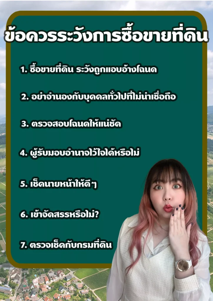 การซื้อที่ดินควรเลือกซื้อกับผู้ที่มีใบอนุญาตทางราชการให้ทำการจัดสรรที่ดินเท่านั้น เพื่อป้องกันการหลอกลวง
